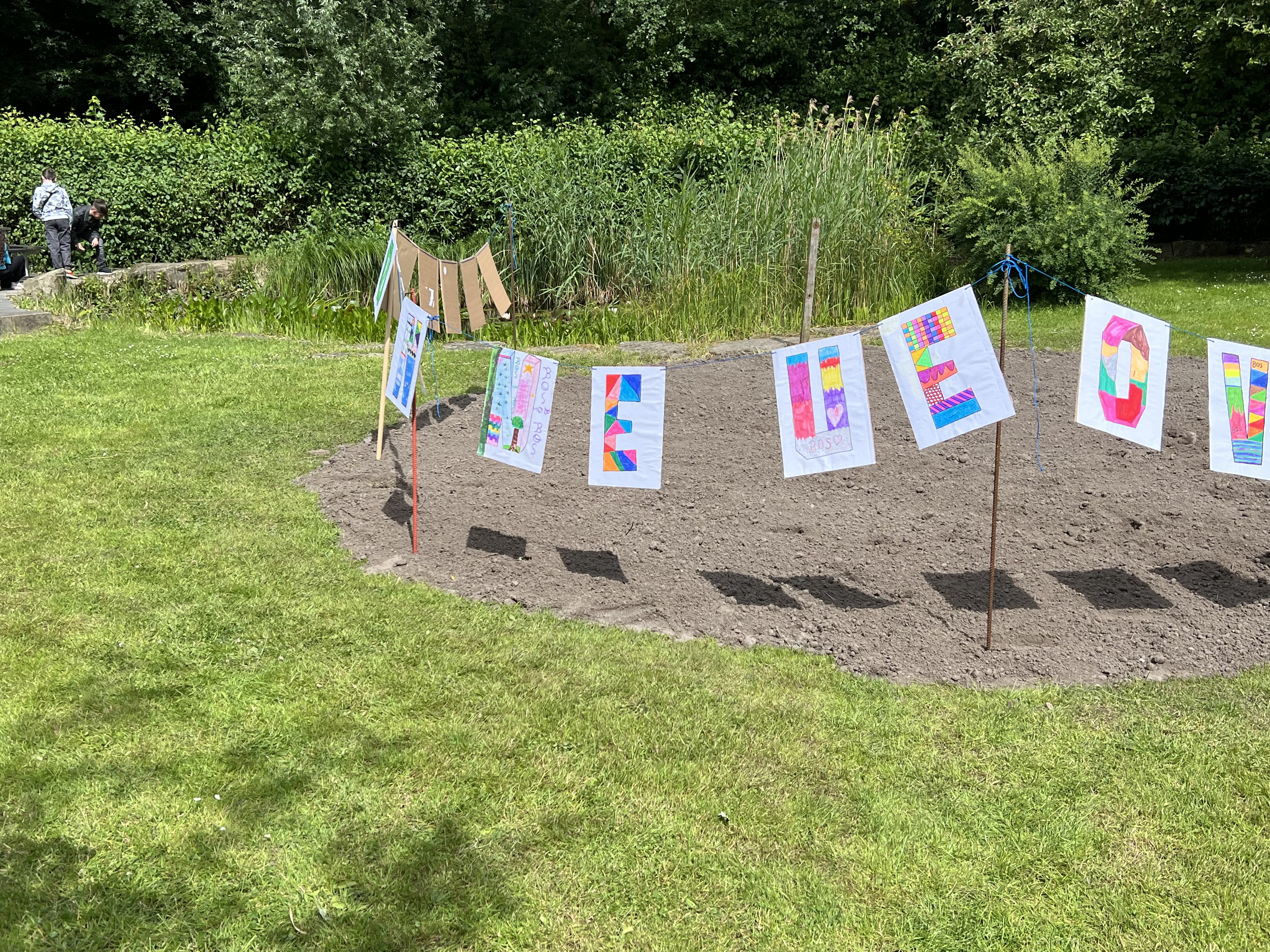 Als die neuen Overberger schließlich mit ihren zukünftigen Klassenlehrer:innen zurück in den Schulgarten kamen, gab es noch eine gemeinsame Abschlussaktion. Alle streuten Blumenamenkonfetti in das neue angelegte Wildblumenbeet. Mögen die Blumen genauso wachsen wie die Kinder an den zukünftigen Herausforderungen.